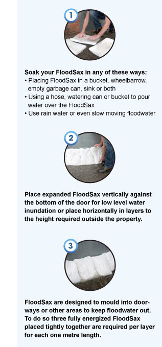Take your FloodSax out of the bag and place in position, energise the bag using water from a hose, bucket, sink or the flood water itself and within minutes you are ready to protect your home or business.