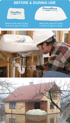 Once the water’s in, it stays in and the bags act just like traditional sandbags. FloodSax can also be ‘energised’ well in advance of a flood with a bucket or hose. However if time’s against you the flood water will do the trick.